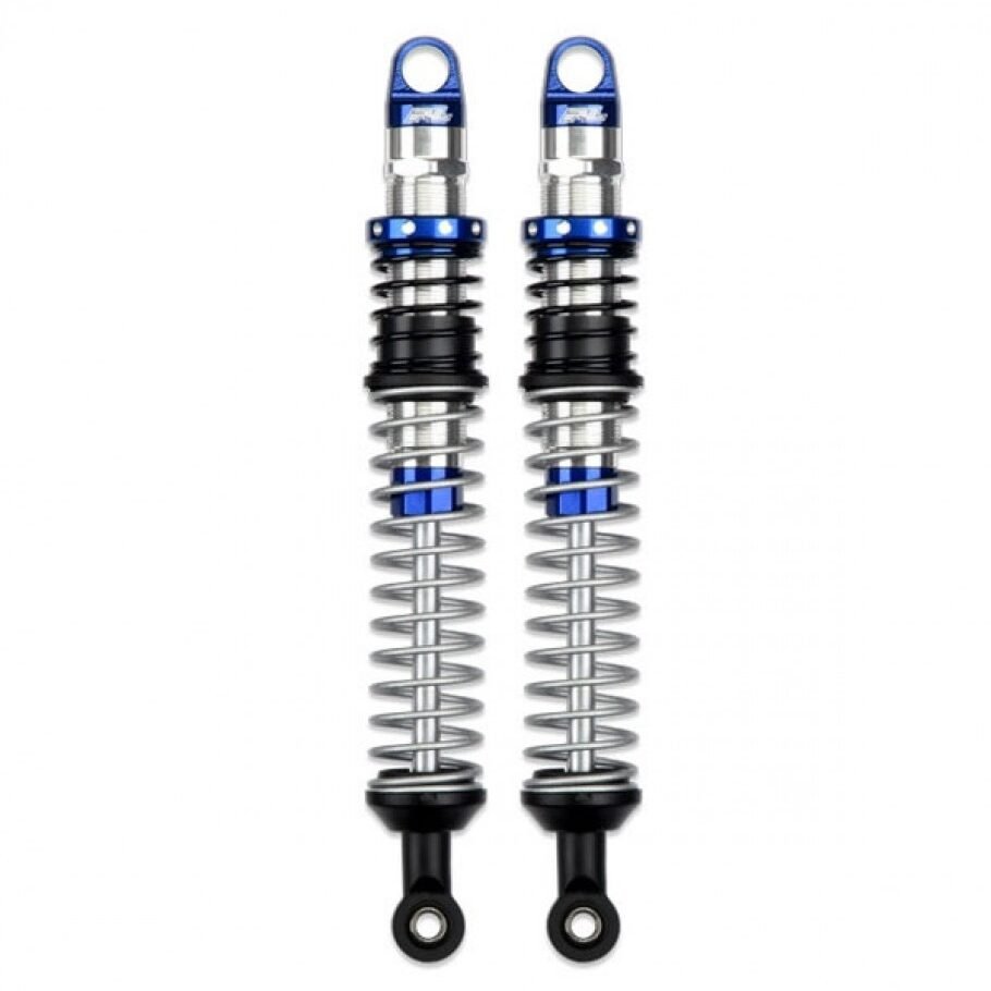 This is a pair of Pro-Spec Scaler Shocks. Pro-Line is proud to announce the next generation of RC Shock Technology with our all-new Pro-Spec Scaler Shocks! The new Shocks feature CNC machined Aluminum Shock Caps, Collars, Bodies, Bottom Caps and Hard Chrome Coated Steel Shock Shafts all made to exacting tolerances. X-Ring seals are used as the main shaft seal for smooth, low friction action and to prevent leaks. Just like Pro-Line’s other Pro-Spec Shocks, the new Scalers are meant to stand out from the crowd with bright Chrome and Blue anodizing. From the top mounting hole to the bottom mounting hole these Pro-Spec Scaler Shocks measure out to be 105mm at full extended length and collapse down to about 72mm and they include extra 5mm longer Shock Ends to increase the shock length! These shocks are perfect for super scale rigs! Just like Pro-Line’s extremely popular PowerStroke Shocks, the Pro-Spec Scaler Shocks come mostly pre-built (just add oil) and are designed to fit on many popular crawler vehicles. They also include Scale looking and performing Dual Rate Springs.