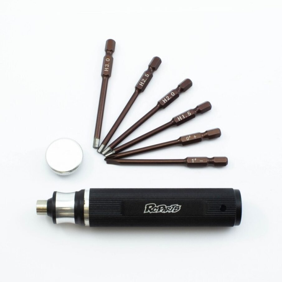This is the 6-in-1 Screwdriver set from RC Parts. This 6-in-1 tool set includes a storage handle with six different tips (Hex 1.5mm, 2mm, 2.5mm and 3mm, flat screwdriver and Phillips Screwdriver). Tips marked for easy identification.
