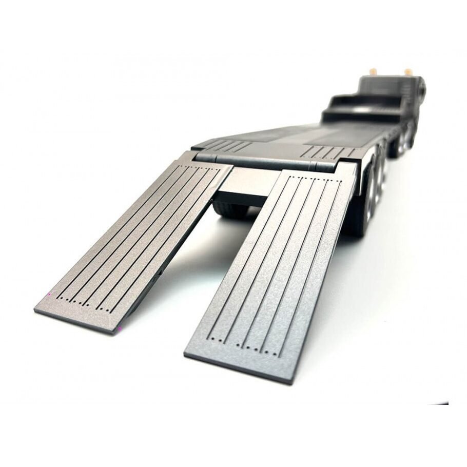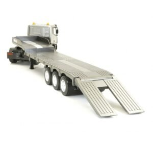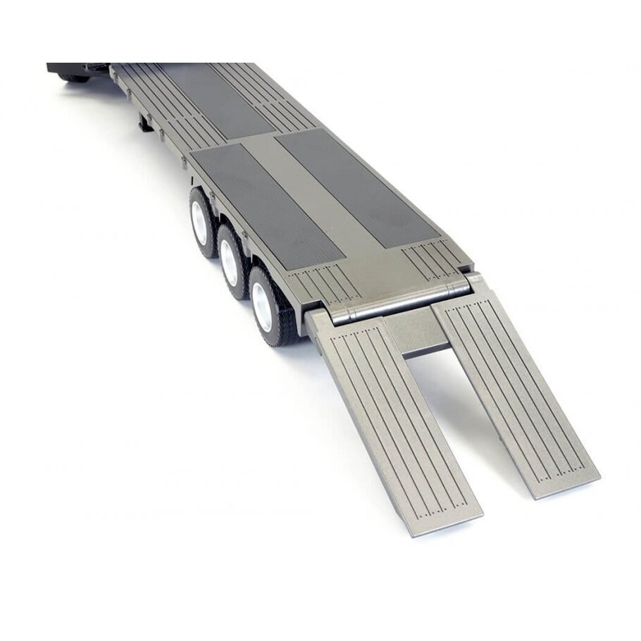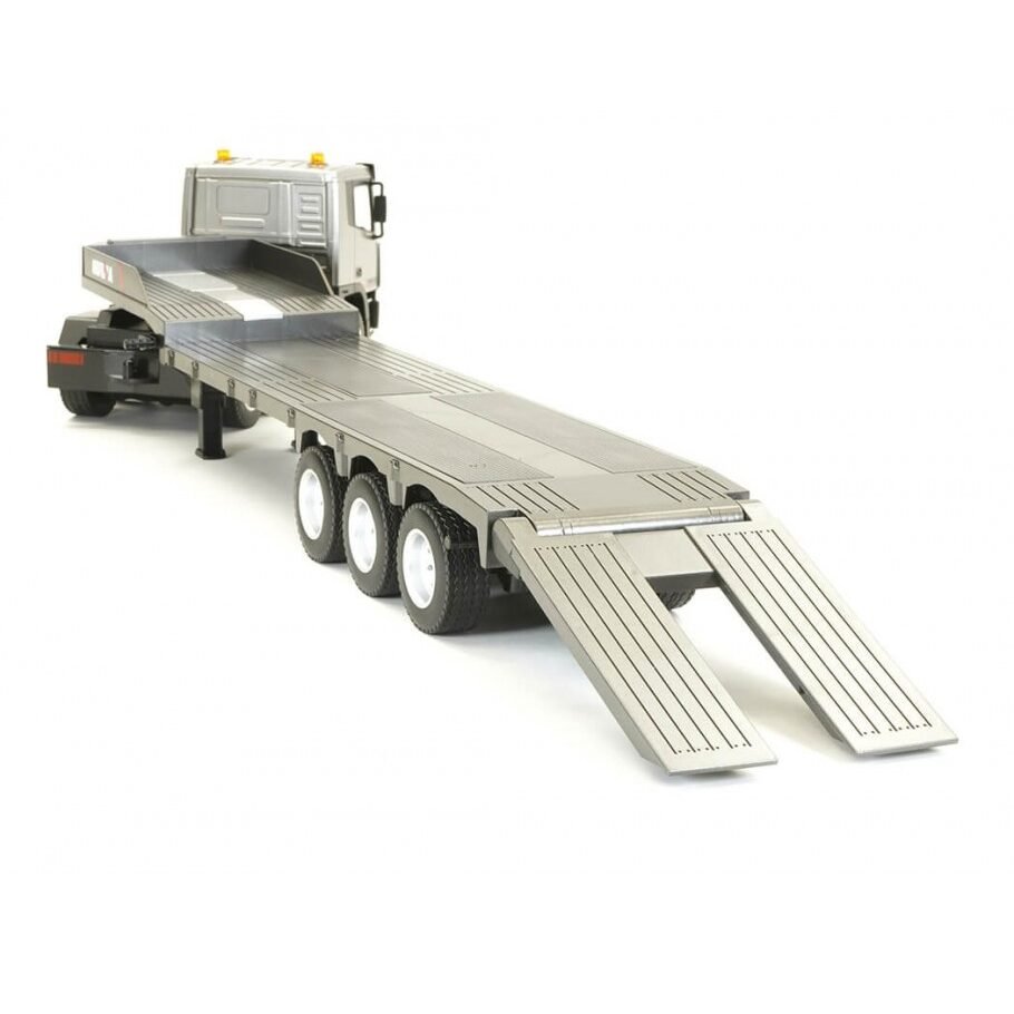 Simulate transporting loads or machinery with this 9ch 1:24 scale truck and flat bed trailer from Huina. With the flat bed mounted separately to the main cab, 270° cab rotation can be achieved for manuovering in tight spaces. The tailgate can be raised and lowered for easy loading. A one press button from the transmitter provides simulated sounds and LED lights on the cab. When unhitched, the flat bed is supported by adjustable front legs, leaving you free to drop your load and return later.