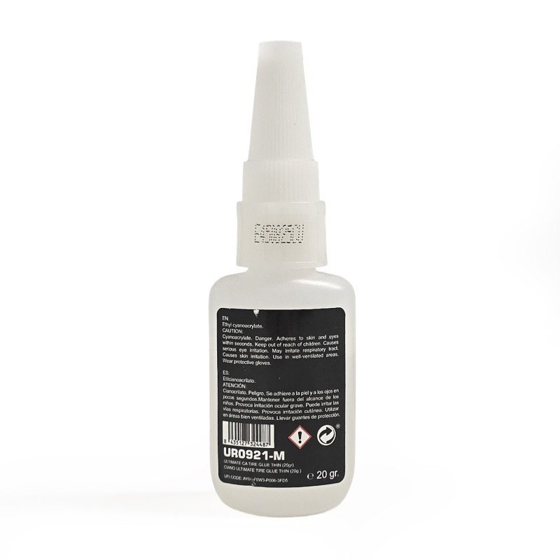 This is the CA Tire Glue Thin 20gr from Ultimate Racing. This ultra strength tire glue is thinner than most tire glues so it can wick down between the tire and the rim for a good solid bond. This is a fast setting tire glue that will set quickly so your tires will be ready to use within a short period of time at the track.