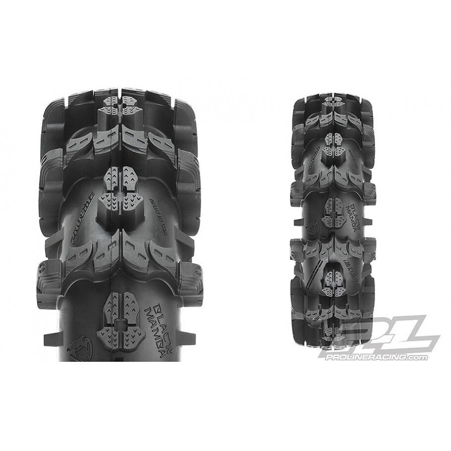 Pro-Line’s officially licensed Interco Black Mamba tires feature a directional tread pattern just like the full-size tires and are just as tough and aggressive as the real thing. Every detail is captured including the lettering on the tire carcass and the multi-stepped tread. Made from Pro-Line’s legendary M2 compound for maximum mud flinging traction from the start. Don’t get stuck in the mud with the wrong tires. Get your own set of fully licensed Interco Black Mamba tires from Pro-Line today!