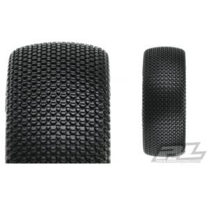 This is a pair of pre-mounted Slide Lock 1/8 Buggy Tires. The Slide Lock is a unique tire design from Pro-Line that is made specifically for smooth, low grip tracks. The Slide Lock features a pattern of small, tightly packed hexagon and triangle shaped pins so you can lay down as much rubber as possible. The tread on the new Slide Lock is laid out wider across the tire carcass for a flatter profile overall compared to other Pro-Line 1/8 Race Tires. Each hexagon pin has a deep sipe down the middle of the tread for added flex and grip on even the slickest of surfaces. The built-in tread flex means you can run harder compounds for longer wear and still have good traction when you need it. The large and stiff side pins reach far down the sidewall to reduce edginess as much as possible.